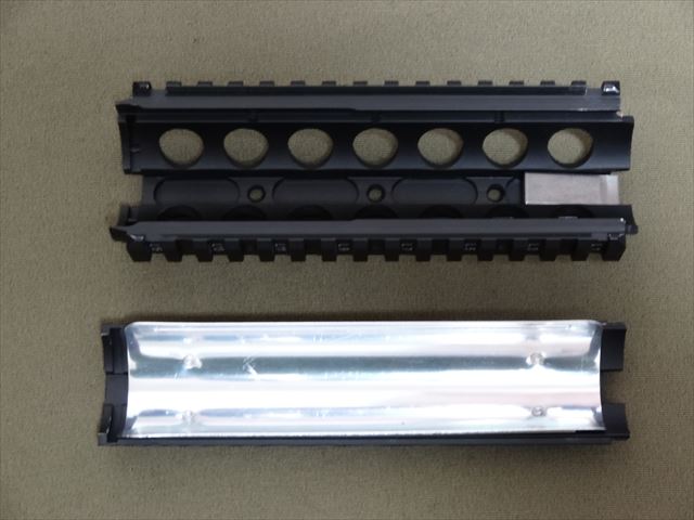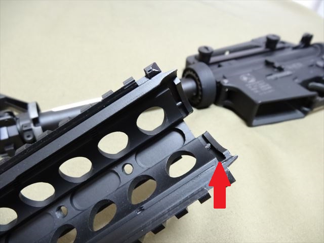 この商品はRISとなっていますがRIS(レール・インターフェイス・システム)は元々ついていたハンドガードの取付方法と同じでハンドガードの前方と後方の2点で固定するタイプです。利点としてはレイルに様々なアクセサリーを取り付けられることは別にすると既存のハンドガードを外して、それと同じように取り付けるだけという簡便さ。一方欠点としてはハンドガードがバレルに固定されていることになるのでレイルにつけたアクセサリーによりバレルにストレスがかかり、命中精度に影響を与えてしまうということです。