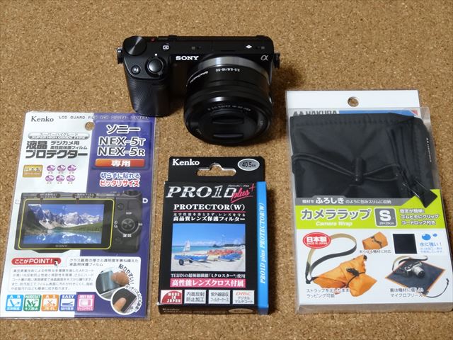 購入したアクセサリーです。液晶保護フィルム、レンズプロテクター、ケースが決まらないので暫定運用のカメララップです。